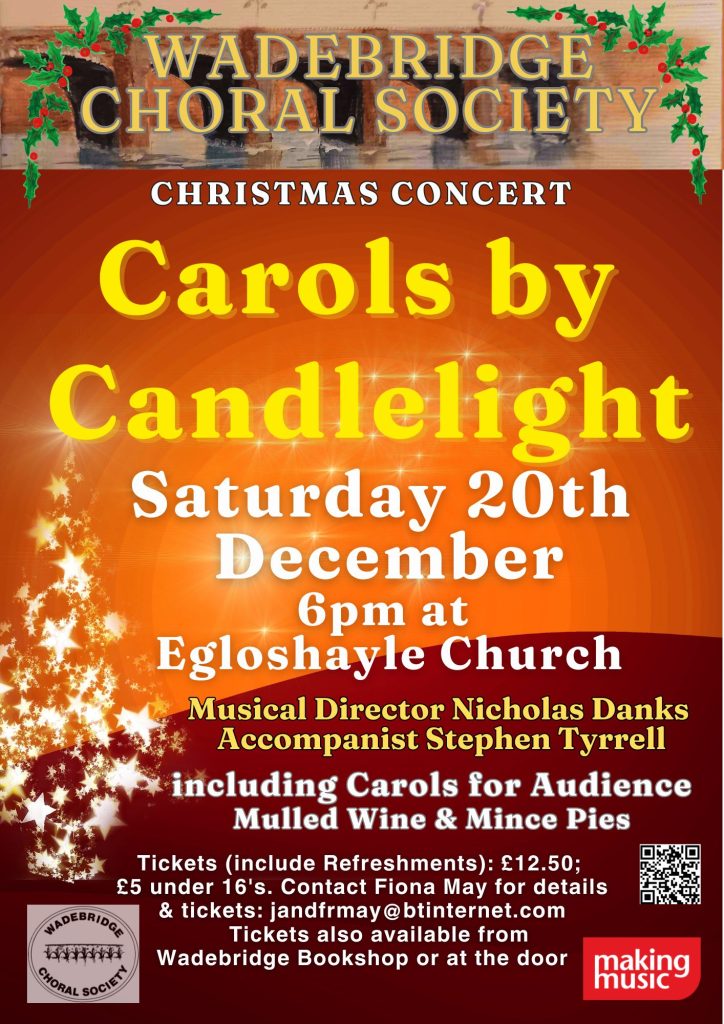 We regularly perform in local choir concerts and events around the Wadebridge area including our Autumn, Christmas, Spring and Summer concerts which are classical concerts held in locations including St Endellion, St Minver, Egloshayle Church and Wadebridge Town Hall.